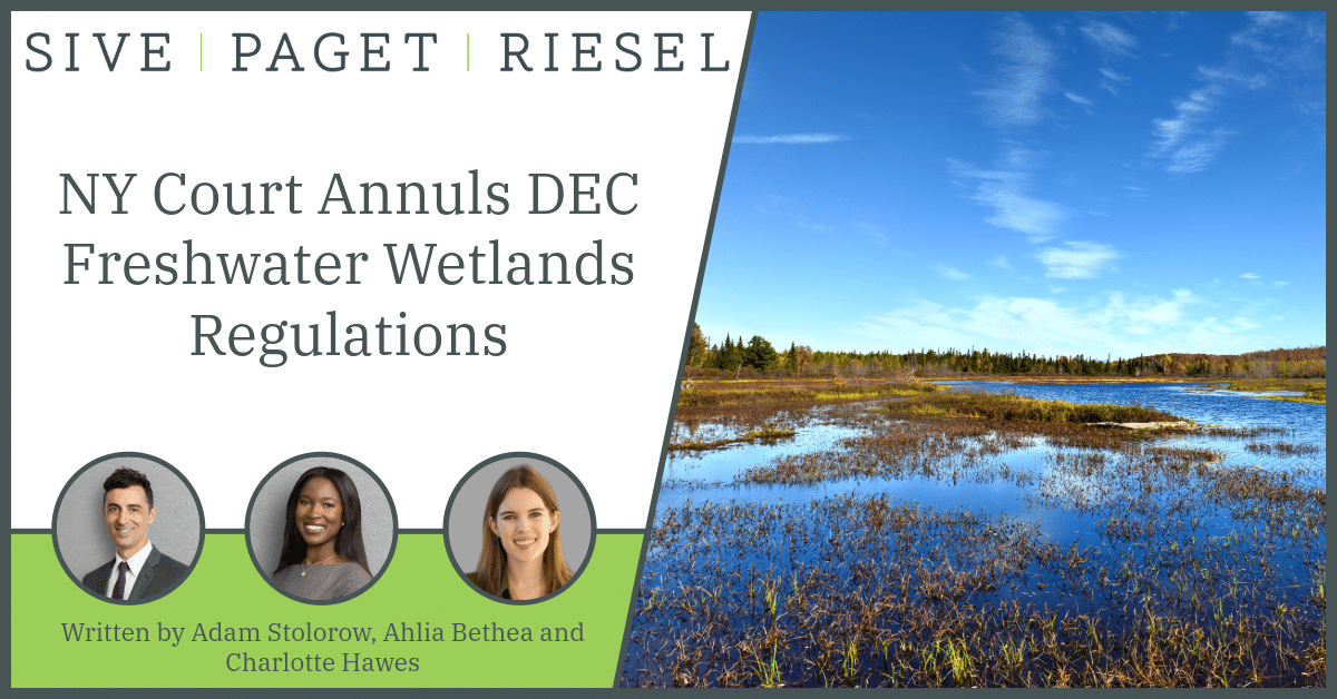 Blog NY Court Annuls DEC Freshwater Wetlands Regulations Read More about NY Court Annuls DEC Freshwater Wetlands Regulations Army Corps Reissues and Modifies Nationwide Permits, Adding One New Permit Read More about Army Corps Reissues and Modifies Nationwide Permits, Adding One New Permit SEQRA Reform Remains Under Deliberation in the FY27 New York State Budget Read More about SEQRA Reform Remains Under Deliberation in the FY27 New York State Budget Recent Developments in U.S. Offshore Wind Read More about Recent Developments in U.S. Offshore Wind NY Public Service Commission Adopts Interconnection Queue Management Framework in Light of New ITC Deadlines Read More about NY Public Service Commission Adopts Interconnection Queue Management Framework in Light of New ITC Deadlines SIGn up for our blog Please leave this field empty Check your inbox or spam folder to confirm your subscription. categories CategoriesCategories Select Category Administrative Law Affordable Housing Brownfields & Remediation Building Management Clean Air Act Clean Water Act Climate Change & Resiliency Construction Due Diligence Environmental Impact Review Environmental Justice Inflation Reduction Act Land Use & Zoning New York Environmental Law NYC Environmental Issues Offshore Wind Permitting PFAS & Emerging Contaminants Renewable Energy Safe Drinking Water Act Solid & Hazardous Waste Stormwater Transportation Wetlands Year In Review Recent Blog Posts: NY Court Annuls DEC Freshwater Wetlands Regulations Apr 17, 2026 Army Corps Reissues and Modifies Nationwide Permits, Adding One New Permit Apr 16, 2026 SEQRA Reform Remains Under Deliberation in the FY27 New York State Budget Apr 10, 2026 Recent Developments in U.S. Offshore Wind Feb 3, 2026 NY Public Service Commission Adopts Interconnection Queue Management Framework in Light of New ITC Deadlines Jan 29, 2026 New NYC Regulation Allows Building Owners to Contest Certain Lead-Based Paint Violations Jan 13, 2026 Thank You For Following SPR’s Blog In 2025! Dec 19, 2025 Federal Agencies Propose New Regulations Defining “Waters of the United States” Dec 19, 2025 NYSDEC Proposes Expanded Green and Sustainable Remediation Policy, Adds New Hurdles to Renewable Energy Development on Remediation Sites Nov 21, 2025 1 2 3 … 22 Next »