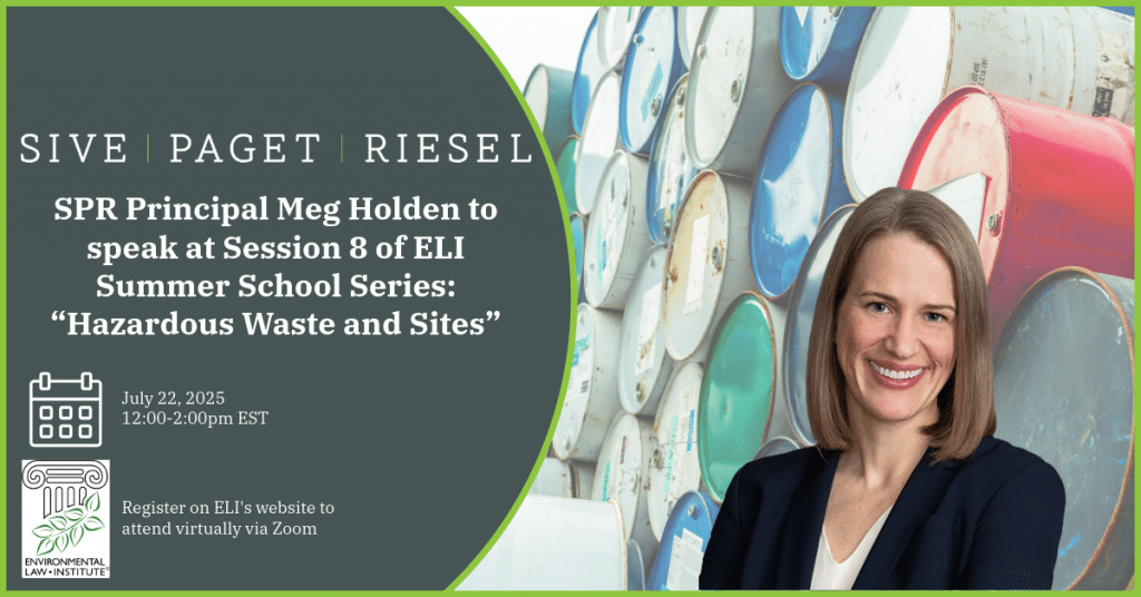 On July 22, from 12:00-2:00pm EST, SPR Principal Meg Holden will serve as a panelist for Session 8 of the Environmental Law Institute’s Summer School Series on “Hazardous Waste and Sites.” ELI’s Summer School is a series of seminars offering an introduction to the legal and policy foundations of environmental protection in the United States.…