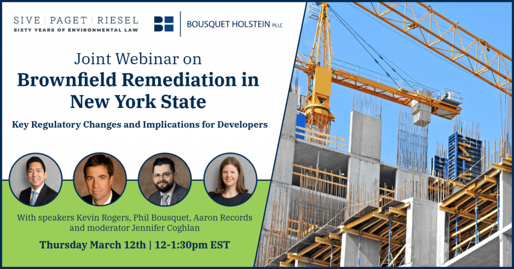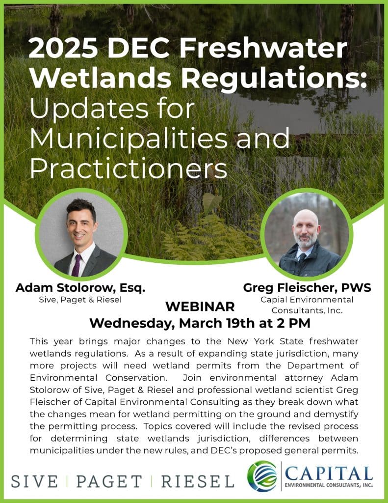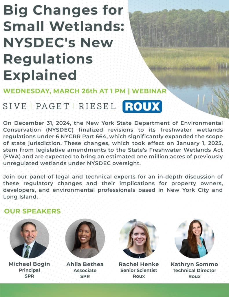 Join us for a live complimentary webinar on Wednesday, March 26th at 1 PM EDT, “Big Changes for Small Wetlands: NYSDEC’s New Regulations Explained.” This presentation, featuring Sive, Paget & Riesel’s Michael Bogin and Ahlia Bethea, and Roux’s Rachel Henke and Kathryn Sommo, will provide an in-depth discussion of these regulatory changes and their implications…