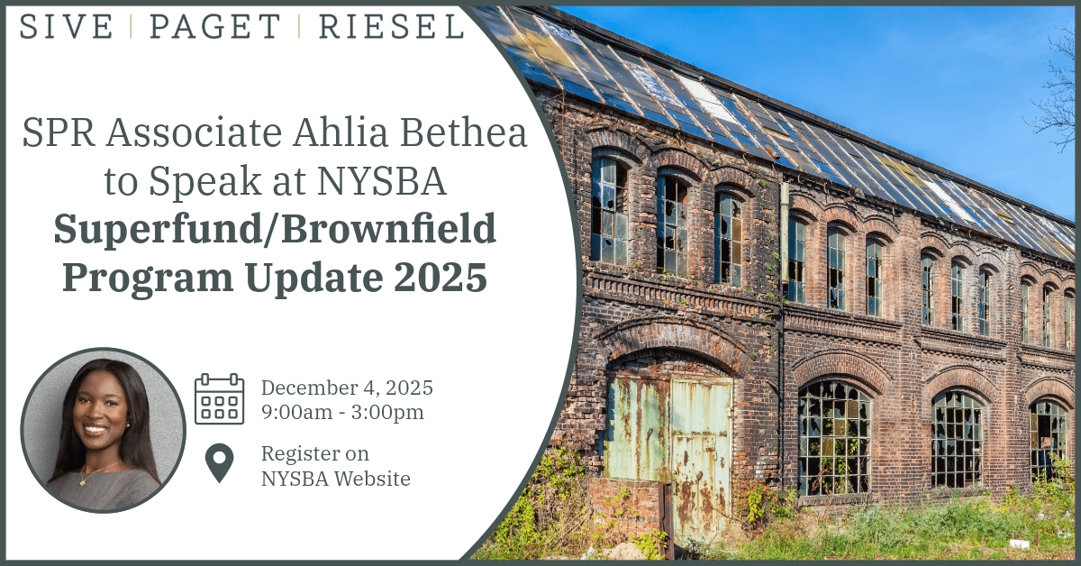 On December 4th, SPR Associate Ahlia Bethea will be speaking at the annual New York State Bar Association Superfund/Brownfield Program Update. The Superfund/Brownfield Program Update 2025 will explore recent regulatory and policy changes, best practices in remediation, and emerging trends affecting cleanup and redevelopment projects across the state. Ahlia will serve as a speaker for “Update on New York State Brownfield Cleanup Program,” from 9:10 – 10:10 a.m. The session will review recent amendments, implementation updates, and their impact on redevelopment efforts. The program will be presented as a live webinar and is free for NYSBA members. CLE credits are available.