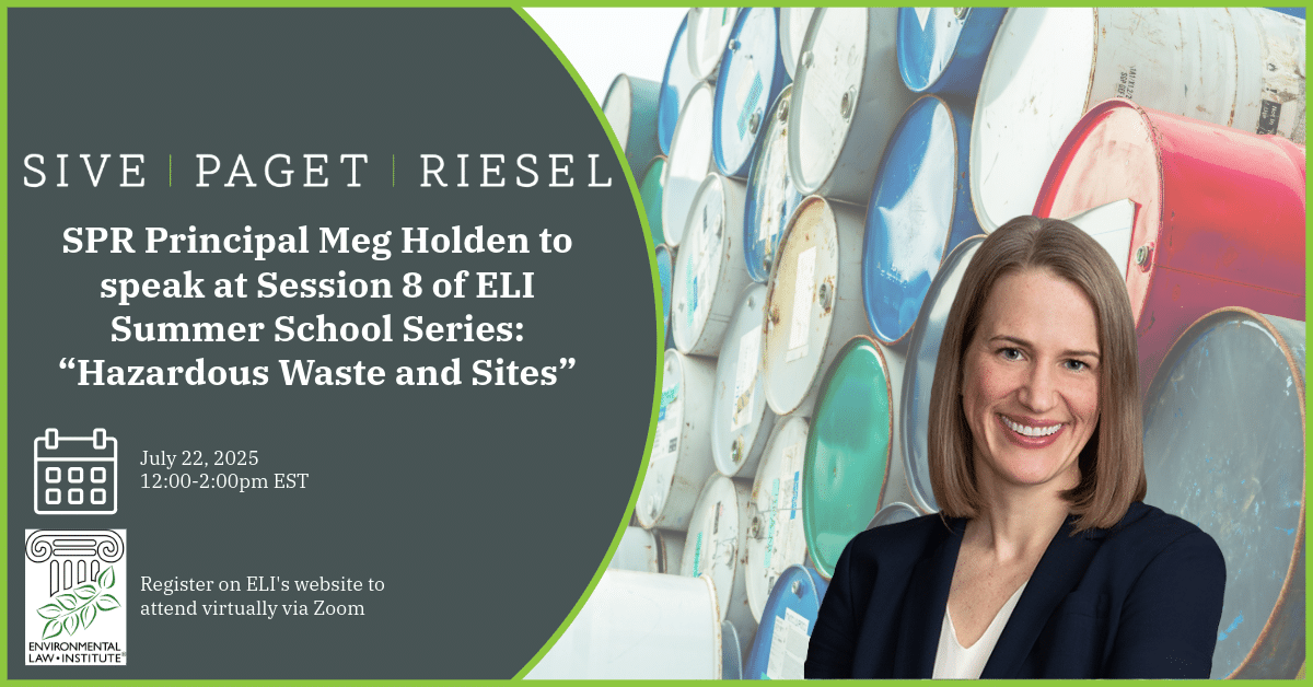On July 22, from 12:00-2:00pm EST, SPR Principal Meg Holden will serve as a panelist for Session 8 of the Environmental Law Institute’s Summer School Series on “Hazardous Waste and Sites.”